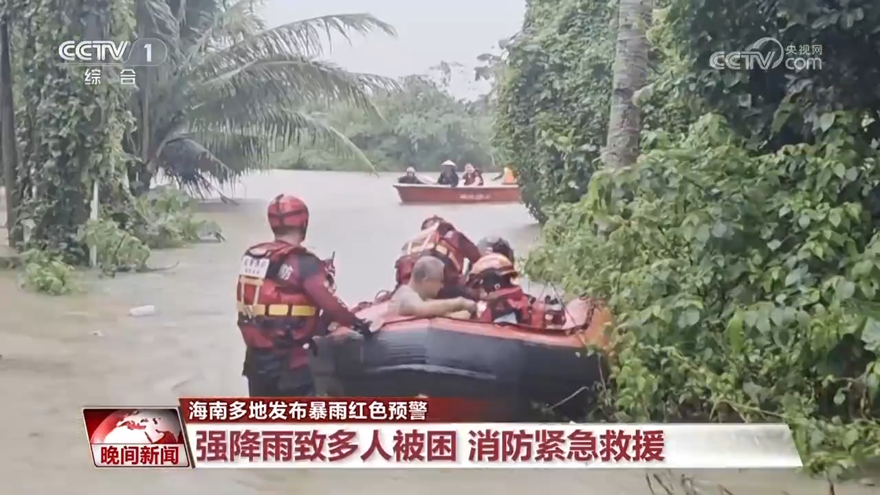 受强降雨影响,琼海多地水位上涨,有人员被困。消防救援人员到达现场后,运用橡皮艇等方式,转移被困群众。
