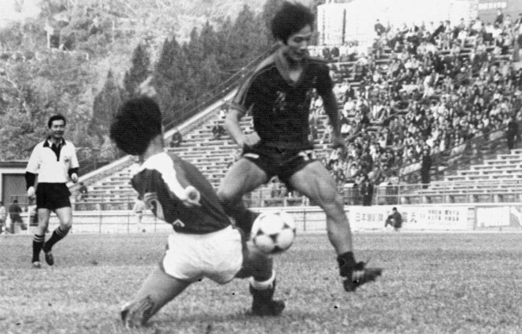 1984年元旦,第六届省港杯足球赛第一回合比赛在香港政府大球场举行,广东队以1:0取胜。图为广东队古广明带球突破对方后卫。新华社记者黄本强 摄