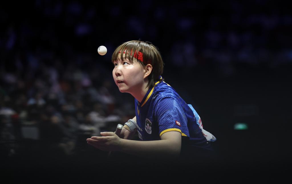 11月16日,澳门队选手朱雨玲在比赛中发球。新华社记者 陈斌摄