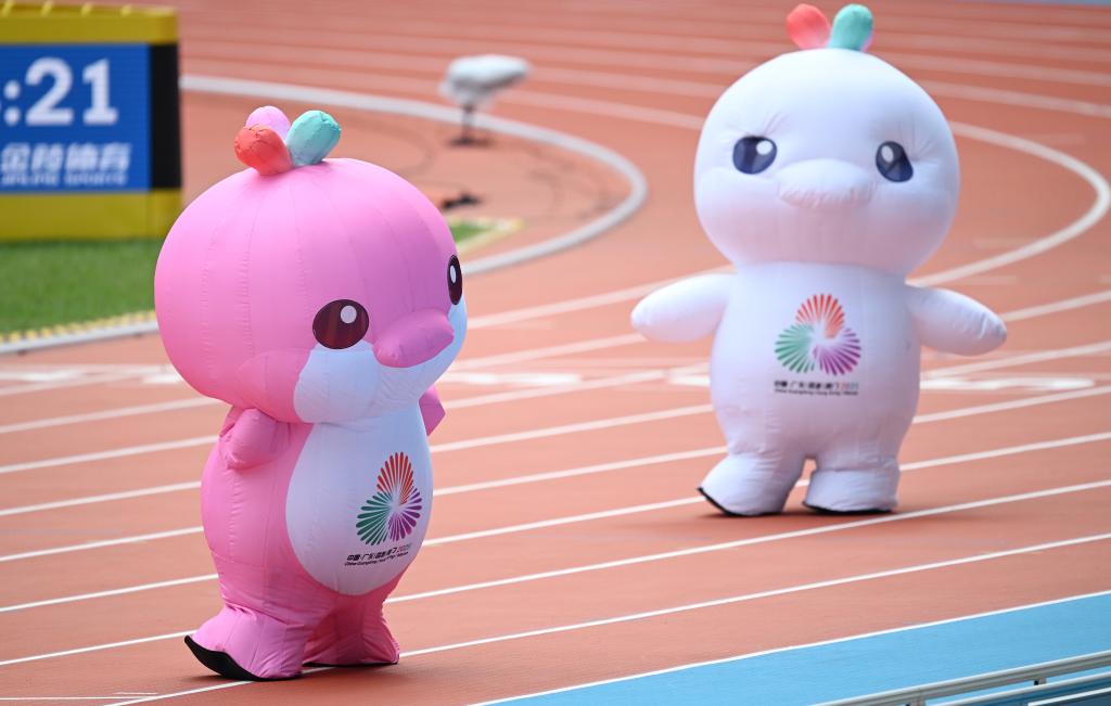 11月15日,吉祥物“喜洋洋”和“乐融融”在比赛间隙表演。新华社记者 邓华 摄