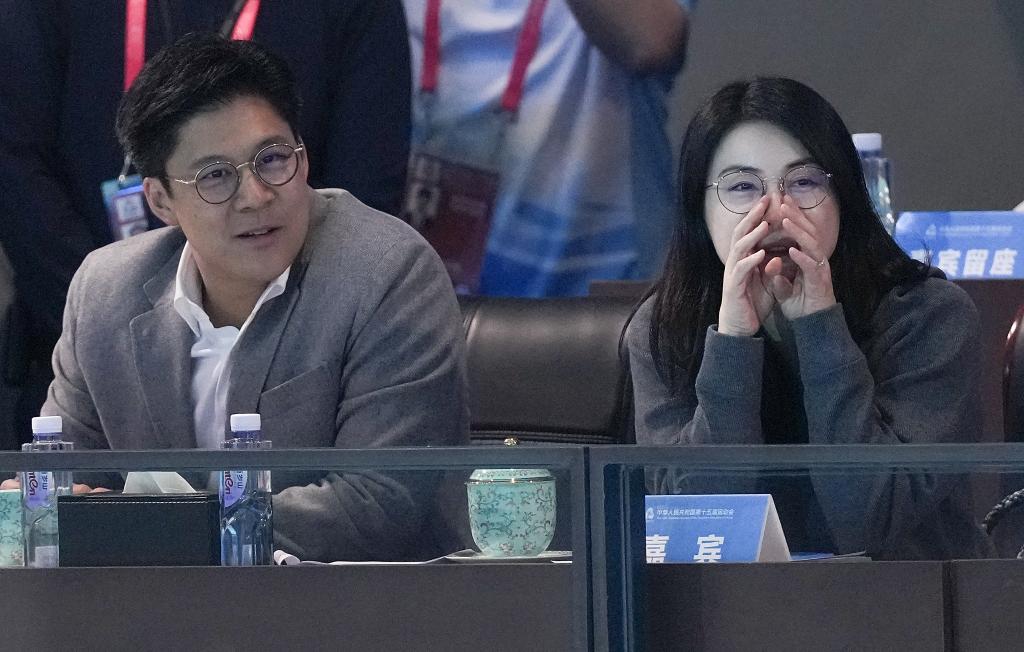 11月13日,郭晶晶(右)和霍启刚在场边观赛。新华社记者薛宇舸 摄