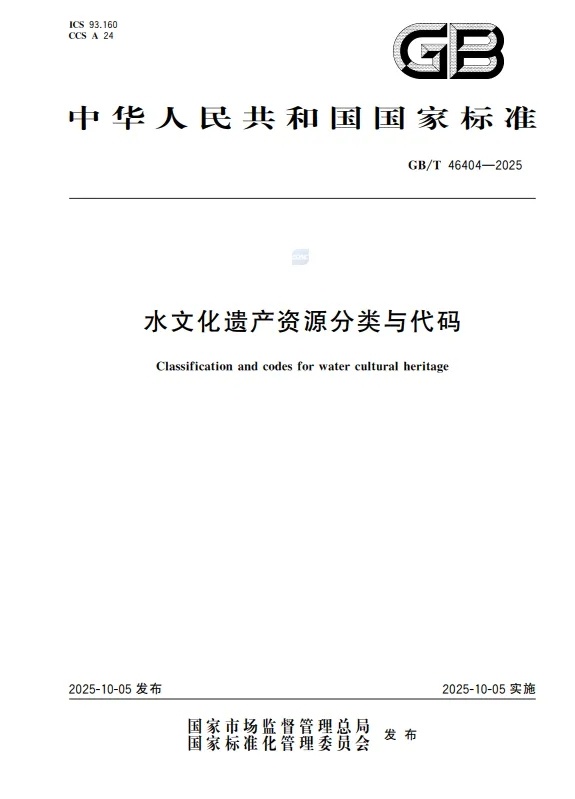 图1 《水文化遗产资源分类与代码》(GB/T 46404—2025)标准封面