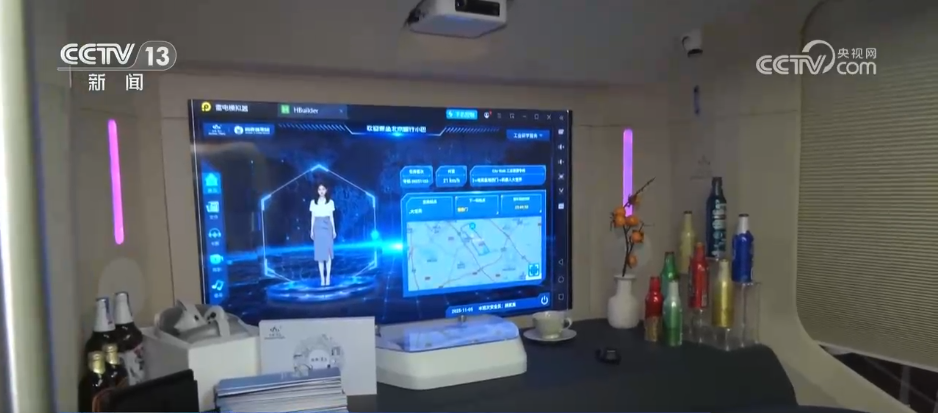 看完了机器人跳舞、踢球,可以到这辆自动驾驶小巴里休息一下,感受未来出行的新体验。这辆小巴里有一个数字人,在车辆行驶的过程中,实时为乘客播报站点,告诉大家下一站要去哪。同时,车内还有一套娱乐系统,您可以在这里唱歌、看电影,甚至还可以喝一杯机器人倒的饮料。