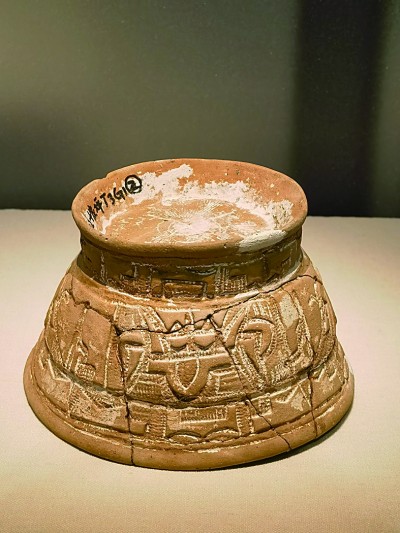高庙文化的陶杯,腹部饰有四组单尖翘翼凤鸟和两组獠牙兽面图案。本报记者李韵摄/光明图片