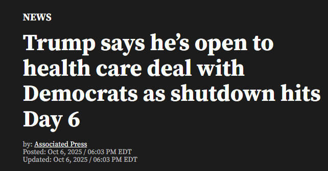 △美联社6日稍早时报道,在政府“停摆”第六天时,特朗普称其愿意与民主党就医疗保健协议展开磋商