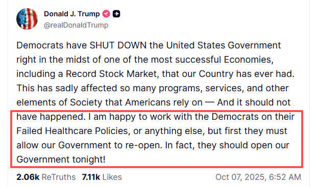 特朗普在社交媒体上发文称:“我们很乐于与民主党就他们失败的医保政策或任何事项合作,但首先他们需要让我们的政府重新开门。事实上,他们应该今晚就让我们的政府开门。”