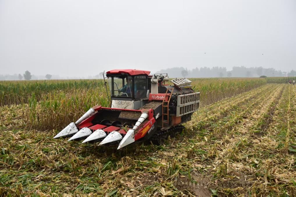记者近日在山西运城市盐湖区北相镇西曲马村田间看到,玉米已成熟,田埂边积着浅浅的泥水,一台履带式收割机正穿梭其间。