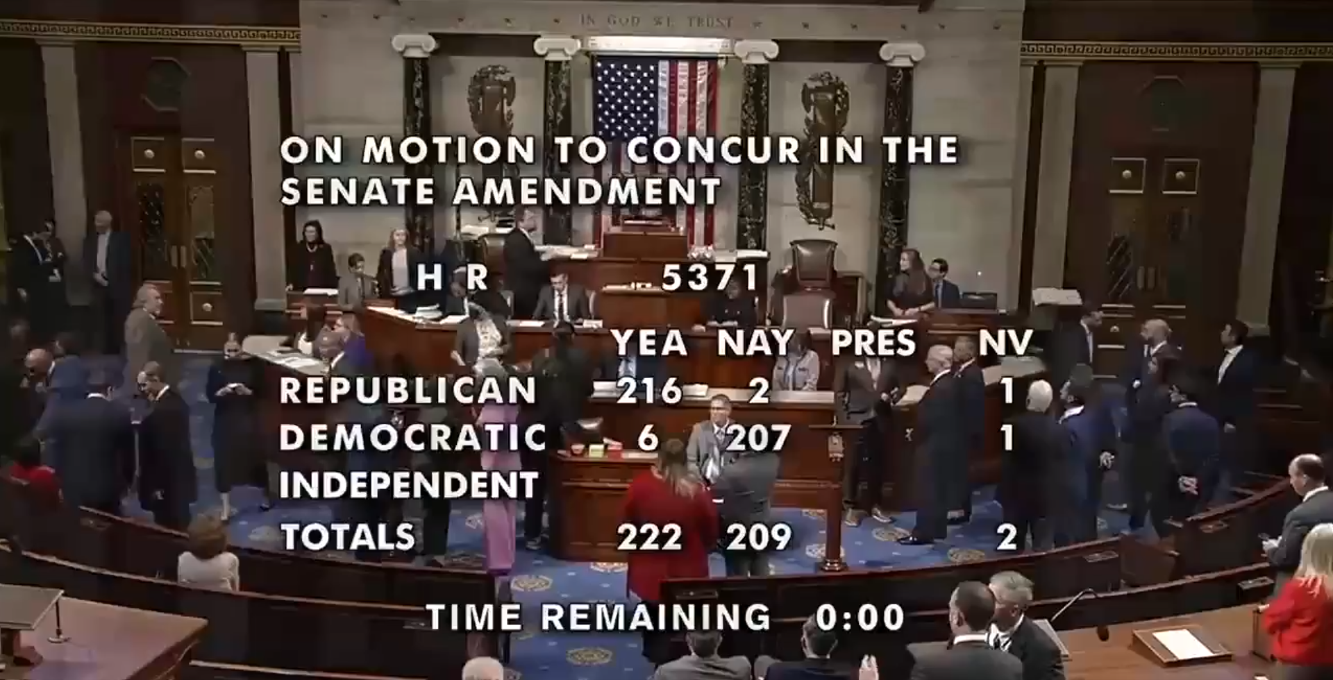 当天,众议院最终以222票支持、209票反对的结果通过该法案。该法案将为联邦政府提供持续拨款,使大部分政府机构获得运作资金直至2026年1月30日。