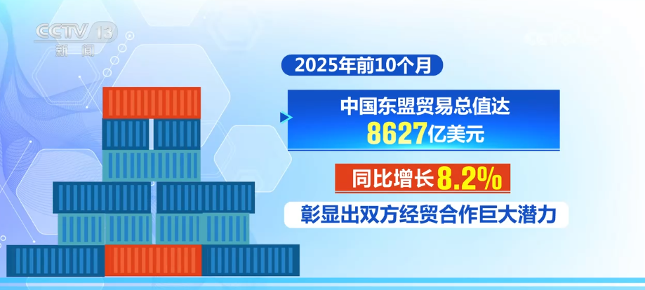 据中国海关统计,2024年,中国东盟货物贸易总值为9821亿美元,规模创历史新高,较2002年中国—东盟开启自贸区建设进程时增长了16.9倍。2022年以来,中国东盟进出口保持稳中向好态势,进出口规模连续3年保持在9000亿美元以上。2025年前10个月,中国东盟贸易总值达8627亿美元,同比增长8.2%,彰显出双方经贸合作巨大潜力。