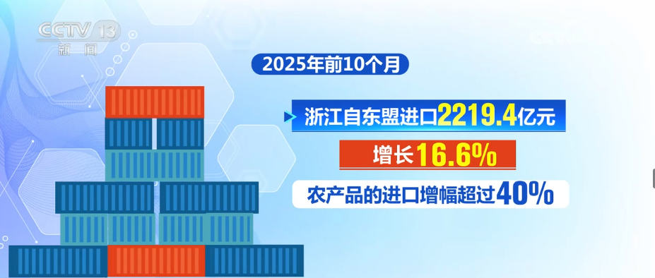 据海关统计,2025年前10个月,浙江自东盟进口2219.4亿元,增长16.6%,其中农产品的进口增幅超过40%。
