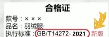“一个标准”是指羽绒服合格证上的执行标准是否为新国标GB/T14272—2021。