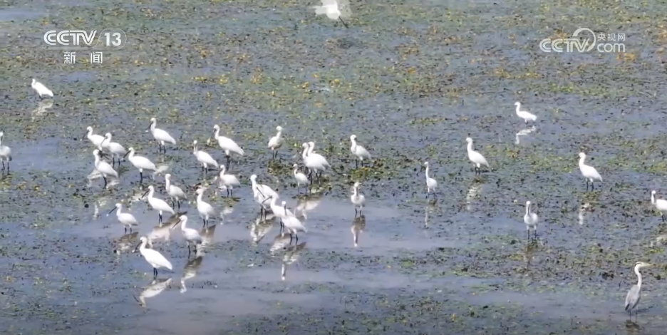 从9月底到10月初,上万只候鸟就陆续聚集到湿地中心地带,它们时而游弋觅食于碧波之上,时而振翅齐飞掠过水面。