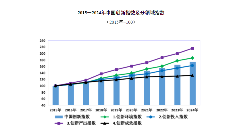 央视网消息:据国家统计局网站消息,根据国家统计局社科文司《中国创新指数研究》课题组测算,2024年中国创新指数为174.2(以2015年为100),比上年增长5.3%。分领域看,创新环境指数、创新投入指数、创新产出指数和创新成效指数分别为186.0、162.6、215.8和132.4,分别比上年增长4.9%、5.1%、8.1%和1.9%。结果表明,2024年中国创新指数保持稳步增长,我国科技创新能力持续提升,创新产出较快增长,发展新动能不断壮大,为经济高质量发展提供有力支撑。