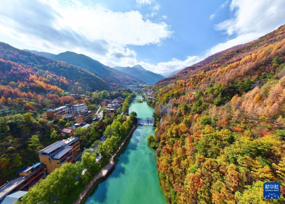 深秋时节,甘肃省陇南市宕昌县官鹅沟景区草木色彩斑斓,与秋水相映成景,在晴空白云下铺展出一幅美丽画卷。