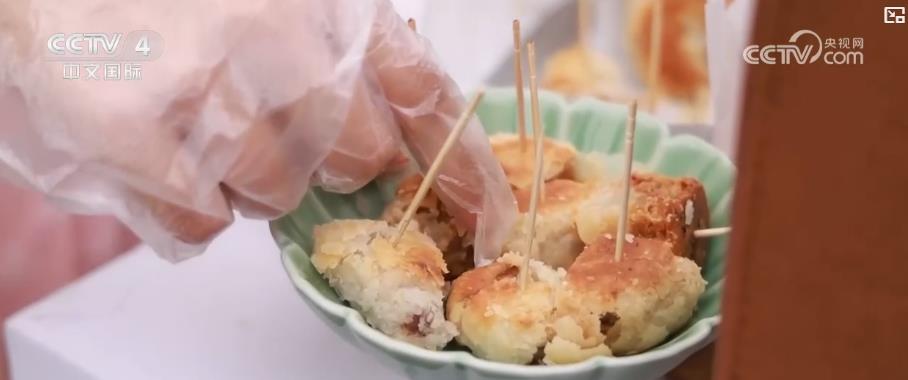 另一边,身着宋韵服饰的“茶仙子”们派发起了径山特色的素酱酥月饼,不少游客驻足品尝。