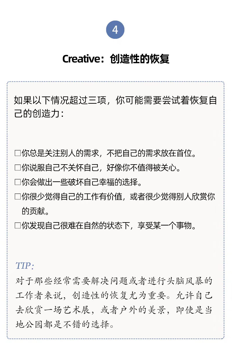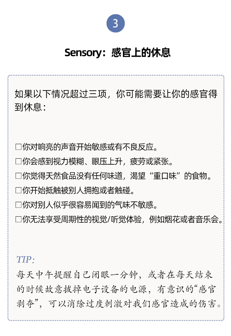 高质量休息的体验,是一种存在,而不是做了什么。我们总结了高质量休息必不可少的三个要素,供大家参考: