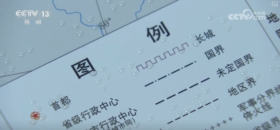 盲文版《无障碍中国地图》使用各种不同类型的凸起符号配合盲文,以触感增效标注了省级行政区划和重点地理标志。
