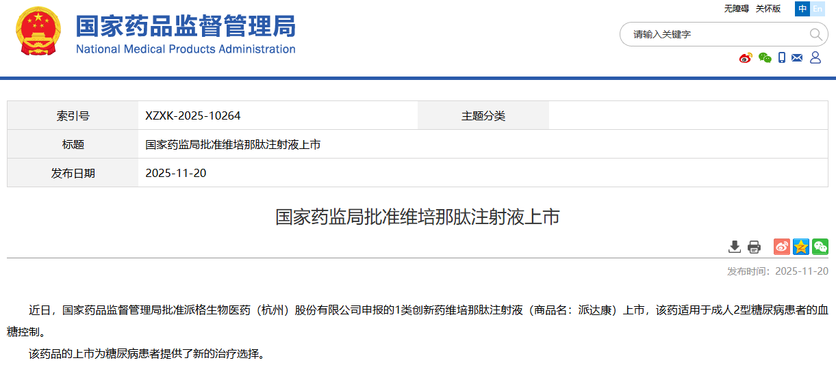 央视网消息:近日,国家药品监督管理局批准派格生物医药(杭州)股份有限公司申报的1类创新药维培那肽注射液(商品名:派达康)上市,该药适用于成人2型糖尿病患者的血糖控制。