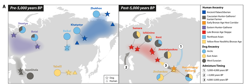 科研团队这项研究首先发现中国五千年前存在独特的家犬古老血统,随后数千年中国古代家犬逐渐出现来自西伯利亚和西方的古代家犬血统渗入,同时来自中国的古老东亚祖份也广泛扩散到了欧亚草原多处。团队通过与人类古基因组数据和证据对照,发现家犬数次渗入事件与人类的多次迁徙高度重合。如东西伯利亚早全新世家犬谱系与同时期人类谱系的分布高度吻合。此外,欧亚草原地区家犬中西方祖分的增加也与古人类迁移历史相吻合,具体而言我们发现欧亚草原前期的新石器时代家犬和东欧狩猎采集人群相关,后期的青铜时代家犬和伊朗农耕人群和高加索狩猎采集者相关。