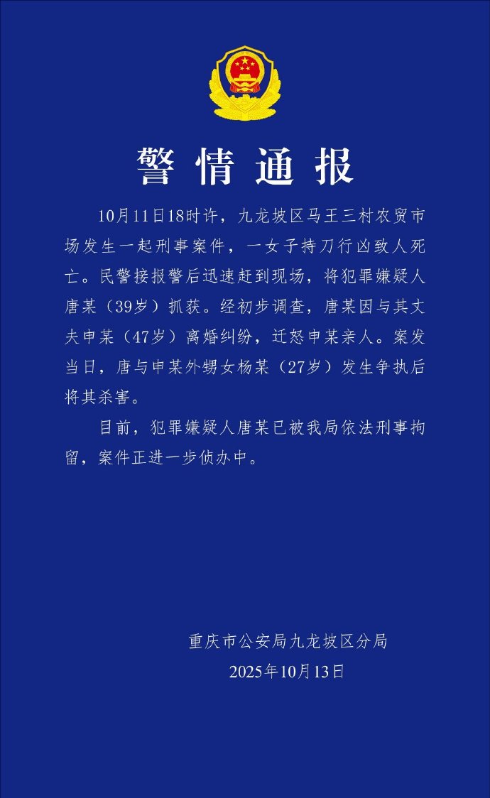 央视网消息:据重庆市公安局九龙坡区分局官方微博消息,重庆市公安局九龙坡区分局10月13日发布警情通报:10月11日18时许,九龙坡区马王三村农贸市场发生一起刑事案件,一女子持刀行凶致人死亡,民警接报警后迅速赶到现场,将犯罪嫌疑人唐某(39岁)抓获。经初步调查,唐某因与其丈夫申某(47岁)离婚纠纷,迁怒申某亲人。案发当日,唐与申某外甥女杨某(27岁)发生争执后将其杀害。目前,犯罪嫌疑人唐某已被我局依法刑事拘留,案件正进一步侦办中。