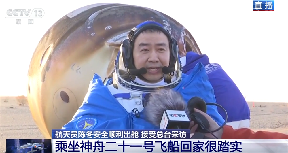 陈冬:乘坐神舟二十一号飞船回家,很踏实。人类探索太空的道路并非坦途,往往充满艰辛和挑战,这次任务是一次锻炼更是一次考验,很自豪,我们圆满完成了任务,中国航天经受住了考验,工程全线交出了一份出色的答卷。这几天,我们始终被党和国家、全国人民、工程全线牵挂着,更加深刻理解了载人航天为什么要坚持生命至上、安全第一,更加深切体悟到把航天员生命安全放在首位这句话的份量。感谢伟大祖国,感谢所有为我们安全回家保驾护航的人们。我们回来了!我为伟大的祖国感到骄傲!