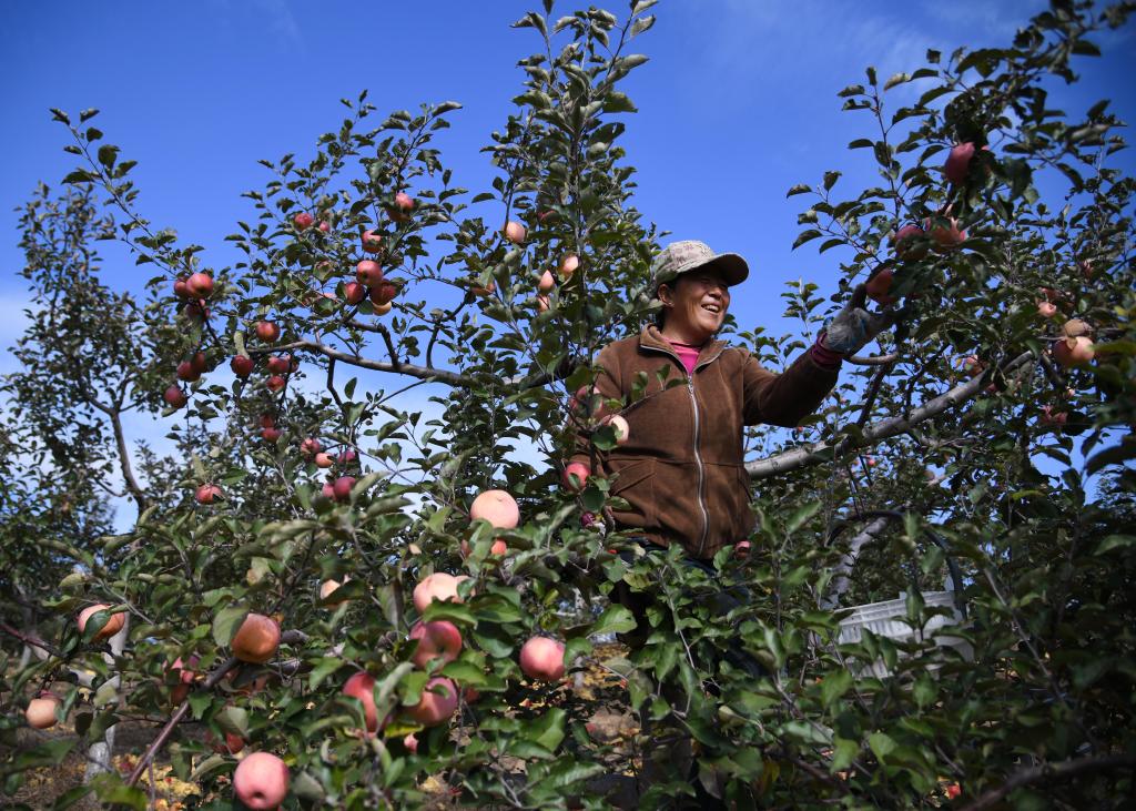 新华社西安11月10日电(记者冯冰、王泽昊)红彤彤的苹果压弯树枝,果农穿梭林间,忙着摘果、剪柄、装筐。记者近日在陕西省榆林市横山区看到,位于毛乌素沙地南缘的山峁迎来苹果采摘季,昔日“荒沙梁”如今成了“花果山”。