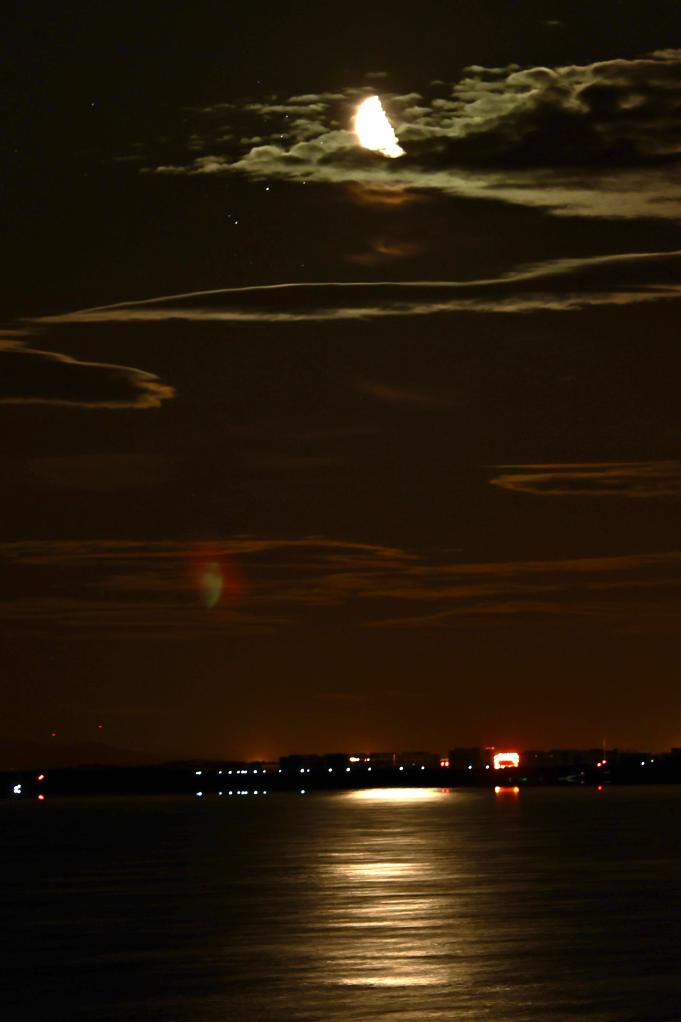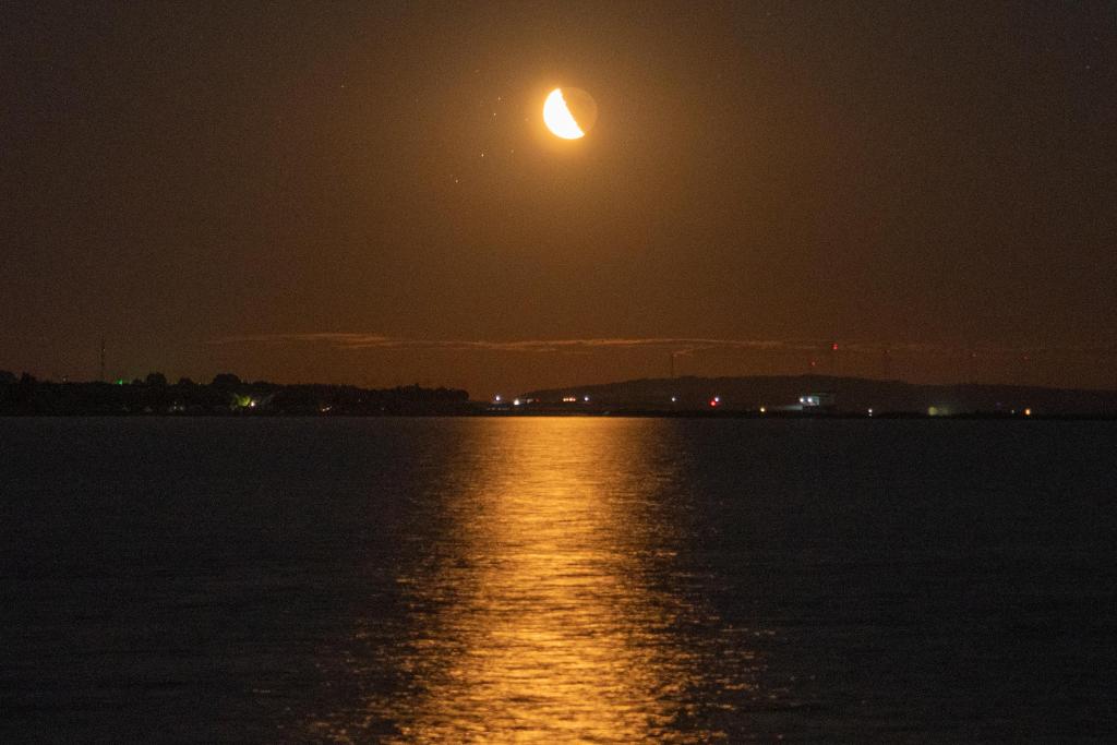 2025年8月16日,在黑龙江省哈尔滨市呼兰河口湿地公园拍摄的月球斜穿昴星团。(李鑫 摄)
