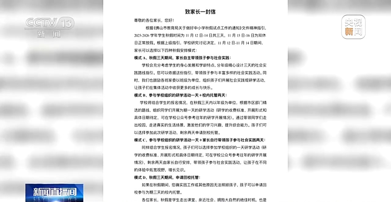 记者从佛山市多所中小学校了解到,春秋假提供3种方案供家长选择:一是学校统一组织校外实践活动,让假期成为孩子拓宽视野、实践学习的平台;二是家长自主安排带娃旅游;三是不参加学校校外研学、家长也没空带娃的,提供校内托管。