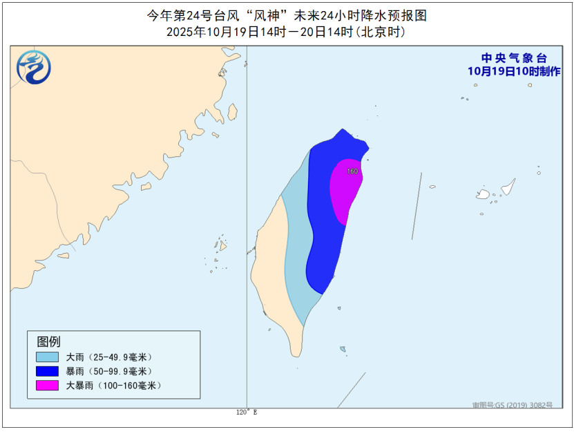 降水预报:19日14时至20日14时,台湾岛大部有大到暴雨,其中,台湾岛东北部的部分地区有大暴雨(100-160毫米)。