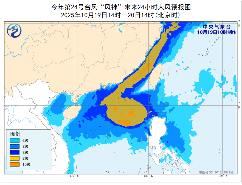 大风预报:受冷空气和“风神”的共同影响,19日14时至20日14时,台湾海峡、巴士海峡、南海北部和中部、西沙群岛、中沙群岛及黄岩岛附近海域、北部湾、琼州海峡、东海西部、浙江沿海、台湾沿海、福建沿海、广东沿海、广西沿海、海南岛沿海将有6-8级大风,阵风9-10级,其中东海西部、浙江沿海、台湾海峡、台湾西部沿海、福建沿海、广东东部沿海和南海东北部的部分海域风力有9-10级,阵风11-12级。