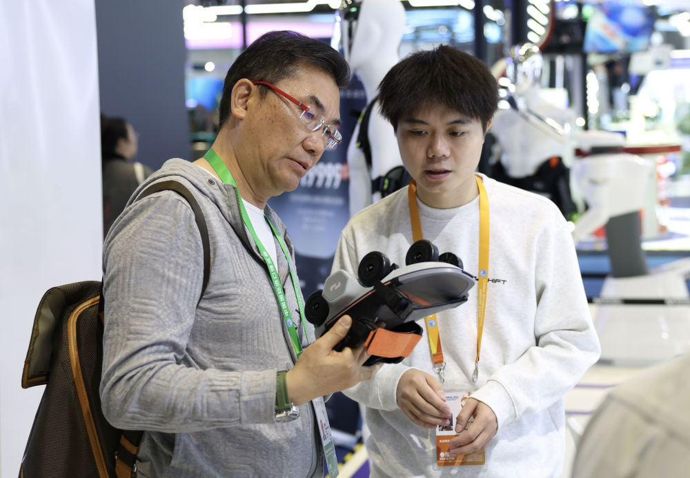 ↑11月6日,在进博会创新孵化专区瞬动科技展台,参展商(右)向参观者介绍其全球首发的踏月者Air轮式外骨骼。