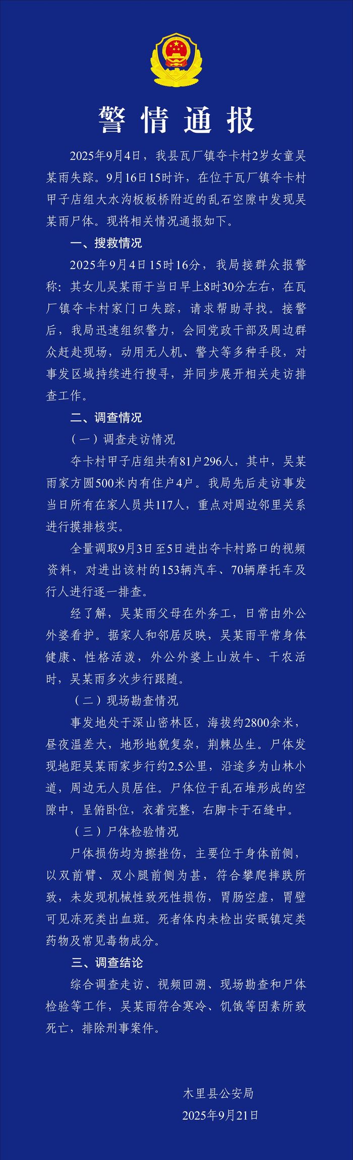 央视网消息:据“木里公安”微信公众号消息,9月21日,四川木里县警方通报,9月4日,木里县瓦厂镇夺卡村2岁女童吴某雨失踪。9月16日15时许,在位于瓦厂镇夺卡村甲子店组大水沟板板桥附近的乱石空隙中发现吴某雨尸体。综合调查走访、视频回溯、现场勘查和尸体检验等工作,吴某雨符合寒冷、饥饿等因素所致死亡,排除刑事案件。