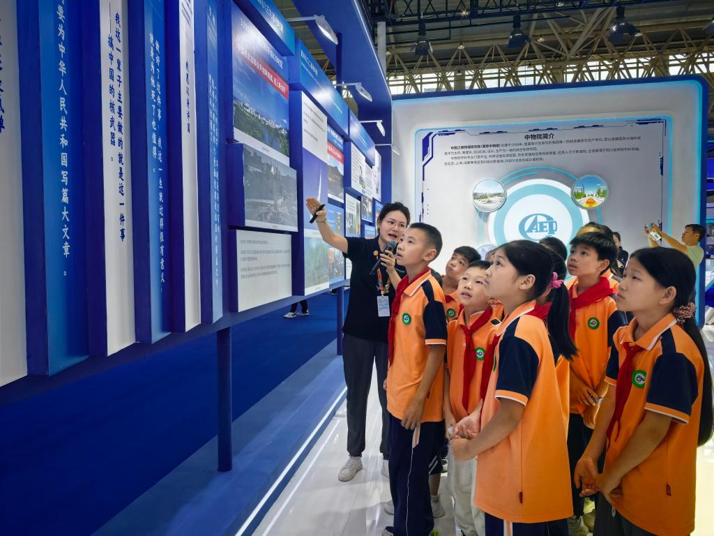 展台工作人员向学生介绍国防军工知识。新华社记者 侯文坤 摄