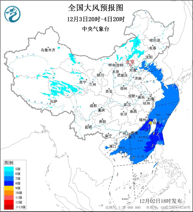 12月3日20时至4日20时,内蒙古中部、河北北部、辽东半岛、甘肃西北部、青海南部、西藏北部等地部分地区有5~6级风,阵风7~9级。渤海、渤海海峡、黄海北部和中部、东海、台湾海峡、台湾以东洋面、巴士海峡、南海北部和中部、北部湾南部海域将有7~8级、阵风9~10级的大风,其中台湾海峡和巴士海峡部分海域风力可达9~10级、阵风11~12级。