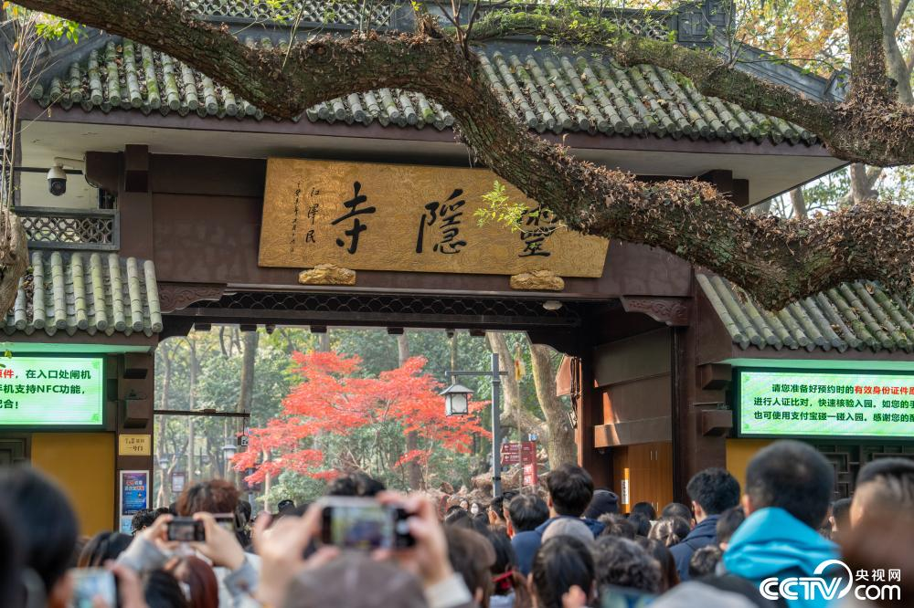 12月1日,杭州灵隐飞来峰景区迎来首个免票日,游客络绎不绝。