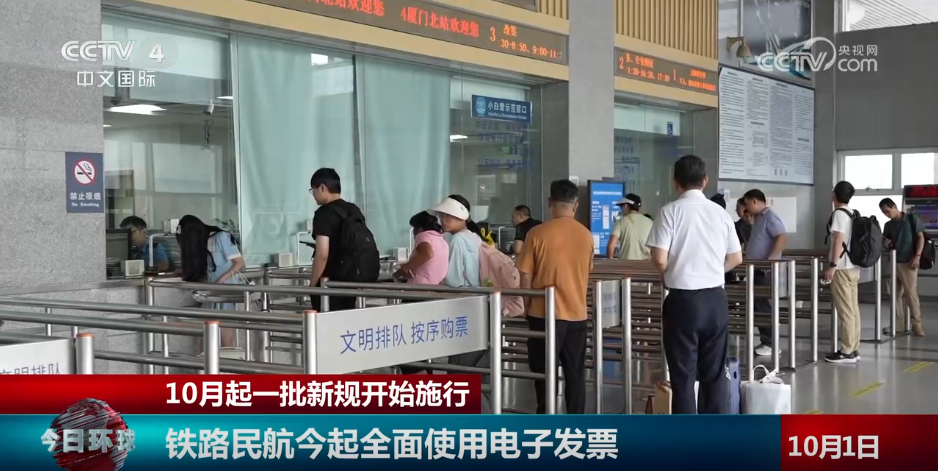 从10月1日起,铁路民航全面使用电子发票。铁路旅客本人在行程结束或者退票、改签业务办理之日起的180日内,可通过铁路12306或车站售票窗口、自动售票机申请开具电子发票。民航境内航线旅客运输服务将全面停止提供纸质行程单。旅客在所购机票所有行程结束后,可通过航空运输企业或代理企业的官网、移动客户端、服务电话等渠道取得电子行程单。