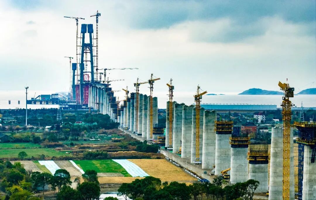 在浙江省嘉兴市海盐县,通苏嘉甬高铁杭州湾跨海铁路桥建设现场如火如荼。计海新 摄