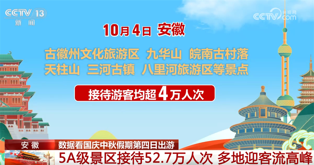 假期第四天,安徽A级旅游景区接待游客348.3万人次。其中,5A级景区接待52.7万人次,同比增长7.6%。