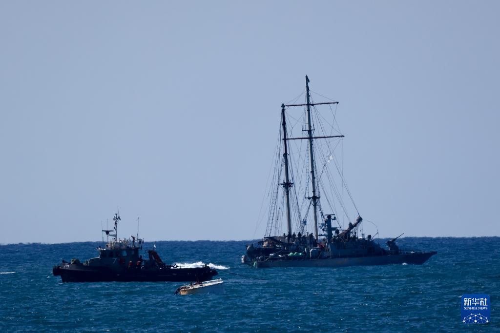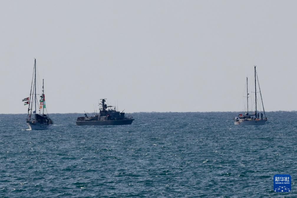 10月2日,在以色列南部阿什杜德港附近,“全球坚韧船队”船只被拖向港口。新华社发(贾马尔·阿瓦德摄)