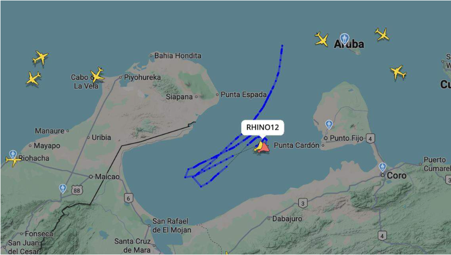 FlightRadar24等网站显示,美国战斗机留下的飞行轨迹表明,它们在委西北部的马拉开波湖北部上空飞行,飞越委内瑞拉湾水域,飞行路线位于委内瑞拉两个能源产业关键地区——苏利亚州的拉瓜希拉市和法尔孔州首府科罗市之间。