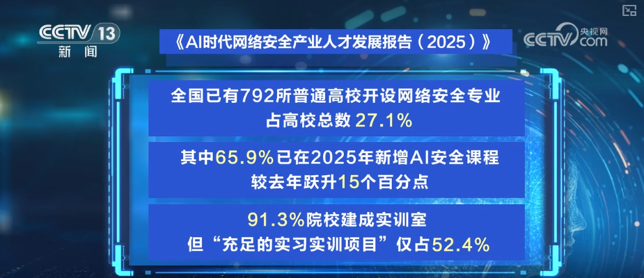 报告显示,全国已有792所普通高校开设网络安全专业,占高校总数27.1%。其中,65.9%已在2025年新增AI安全课程,较2024年跃升15个百分点。91.3%院校建成实训室,但“充足的实习实训项目”仅占52.4%。