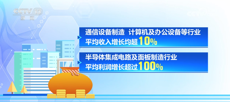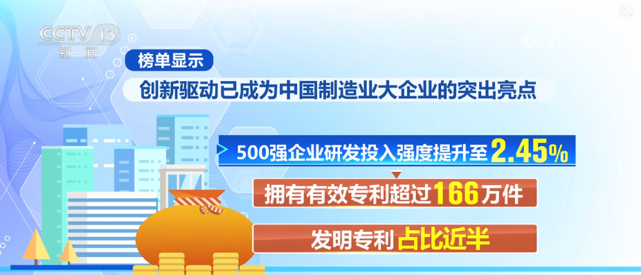 榜单显示,创新驱动已成为中国制造业大企业的突出亮点。500强企业研发投入强度提升至2.45%,拥有有效专利超过166万件,其中发明专利占比近半。其中,通信设备制造、计算机及办公设备等行业平均收入增长均超10%,半导体集成电路及面板制造行业平均利润增长超过100%。