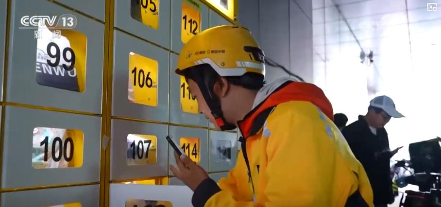 中午时分,记者在北京朝阳区的一处商圈看到,不少外卖员穿梭在写字楼间,将一件件外卖投入智能外卖柜中,方便顾客取餐的同时提高配送效率。