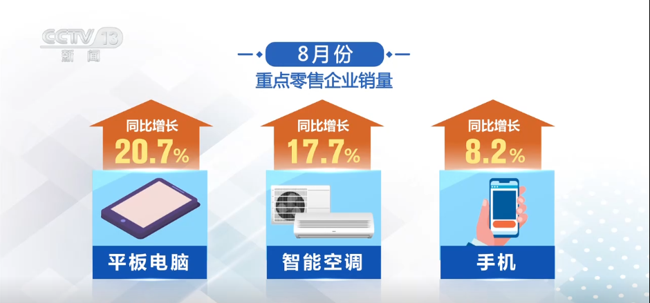 商品消费平稳增长。8月份,商品零售额同比增长3.6%,以旧换新相关商品销售保持较快增长。据商务部监测,8月份,重点零售企业平板电脑、智能空调、手机销量同比分别增长20.7%、17.7%和8.2%。