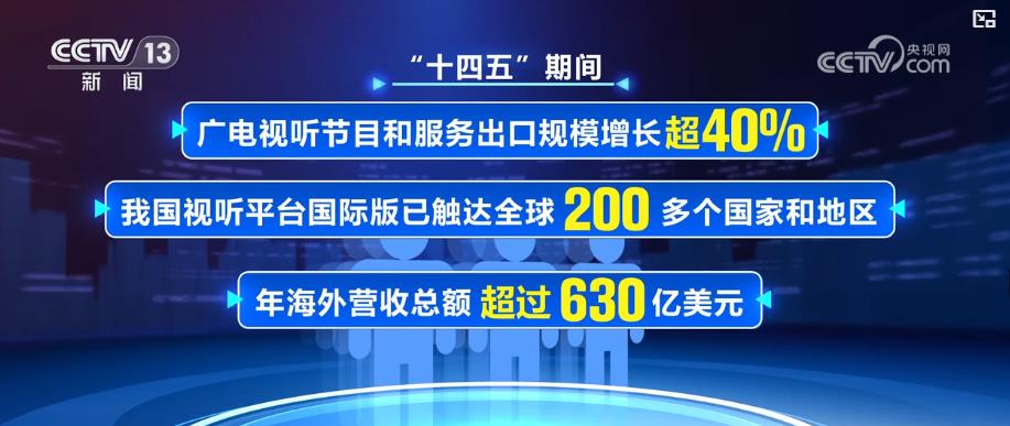 据介绍,“十四五”期间,广电视听节目和服务出口规模增长超40%,我国视听平台国际版已触达全球200多个国家和地区,年海外营收总额超过630亿美元。