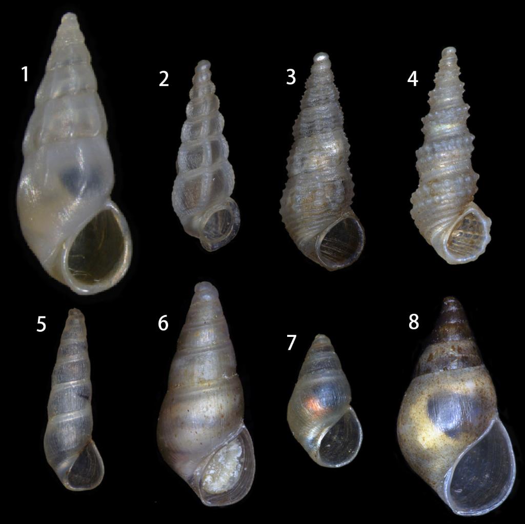 1-8分别是玻璃昆明螺、铁锏昆明螺、流萤昆明螺、珍珠昆明螺、银匙远岸螺、大池远岸螺、冰糯远岸螺、俞元远岸螺。中国科学院昆明动物研究所供图