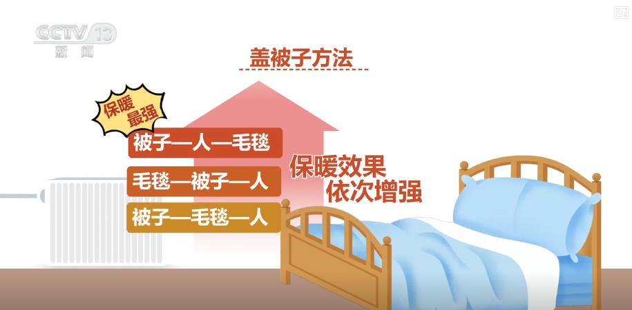 此外,大家生活当中一些常见的保暖方式,稍微做一下调整可能就会有意想不到的效果。比如盖被子方法。如图所示,从上到下的盖被方式依次有:被子——毛毯——人,毛毯——被子——人,被子——人——毛毯。保暖效果依次增强,最强的,竟然是最不常见的夹心盖被法。