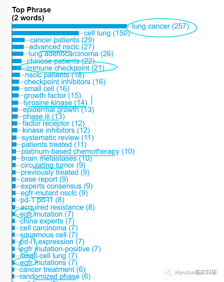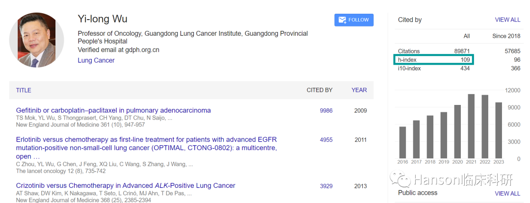 Google Scholar显示,吴一龙教授的研究论文已有89,671次引用,h指数高达109。根据大数据分析的热词结果显示,吴一龙教授所发表SCI论文的关键词集中在肺癌、RCT临床试验、EGFR、酶抑制剂等;显示吴一龙教授通过RCT研究筛检肺癌的免疫治疗和靶向治疗,由此使得肺癌治疗更为精准和个体化。引文分析给出了类似的结果,EGFR突变、HERS突变、ALK阳性等肺癌等是吴一龙教授重要论文的关键词。