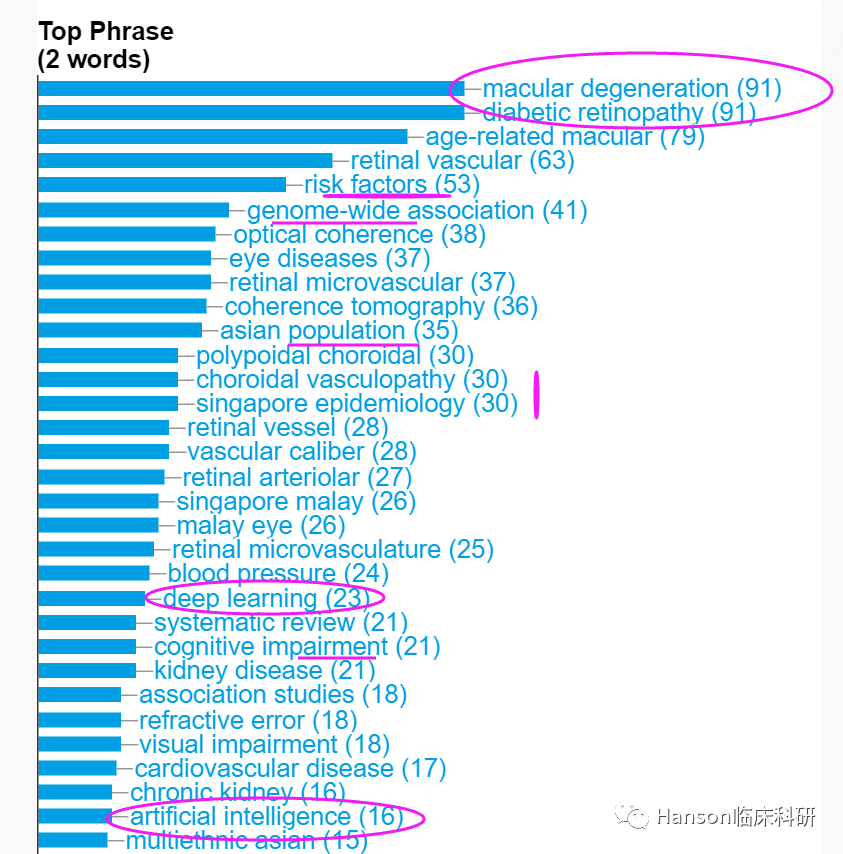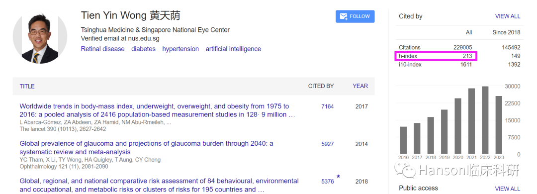 Google Scholar显示,黄天荫教授的研究论文已有229,005次引用,h指数高达213!根据大数据分析的热词结果显示,黄天荫教授所发表SCI论文的关键词集中在黄斑变性、糖尿病视网膜病变、老年性黄斑变性、视网膜血管病等疾病,研发方向则侧重于遗传学、流行病学,并且充分利用深度学习和人工智能等进展获得创新性工作;显示黄天荫教授通过基于对基因变异和环境危险因素的探索,寻找基因-基础疾病-表型间的相互作用,由此寻找疾病发生机制和分子标记、构建精准治疗的策略。引文分析给出了类似的结果,基因组学、遗传变异、危险因素,以及人工智能、深度学习、精准治疗等是黄天荫教授重要论文的关键词。