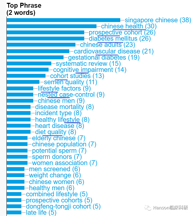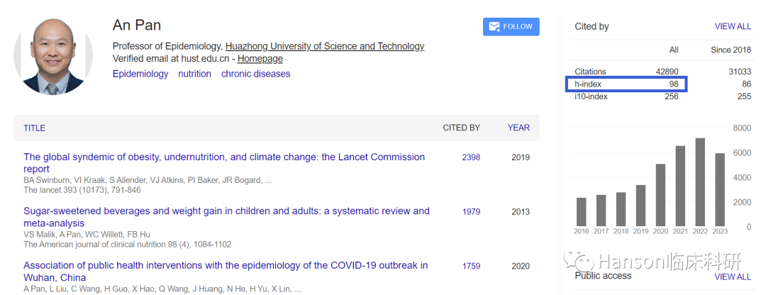 Google Scholar显示,潘安教授的研究论文已有42,890次引用,h指数高达98。根据大数据分析的热词结果显示,潘安教授所发表SCI论文的关键词集中在前瞻性队列、糖尿病、心血管病、认知障碍、肥胖、饮食、生活方式等。显示潘安教授通过前瞻性的队列研究探讨2型糖尿病、肥胖、心脑血管疾病等代谢性疾病的发生发展的生活方式和营养等环境因素,以及表观遗传因素与遗传因素之间的相互作用,由此建立早期预测和高危个体筛选模型。引文分析给出了类似的结果,肥胖、糖尿病、心血管病的队列研究等是潘安教授重要论文的关键词。